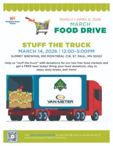 Help us “stuff the truck” with donations for our two free food markets and get a FREE beer on March 14! Bring your food donations and stay to enjoy tasty brews, and more.